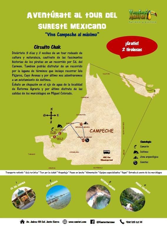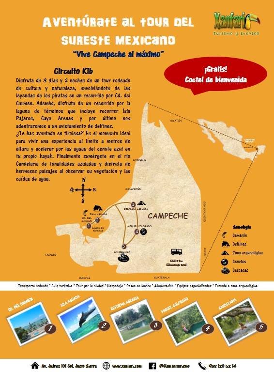 Disfruta de 3 días y 2 noches de un tour rodeado de cultura y naturaleza, envolviéndote de las leyendas de los piratas en un recorrido por Cd. del Carmen. Además, disfruta de un recorrido por la laguna de términos que incluye recorrer Isla Pájaros, Cayo Arenas y por último nos adentraremos a un avistamiento de delfines.